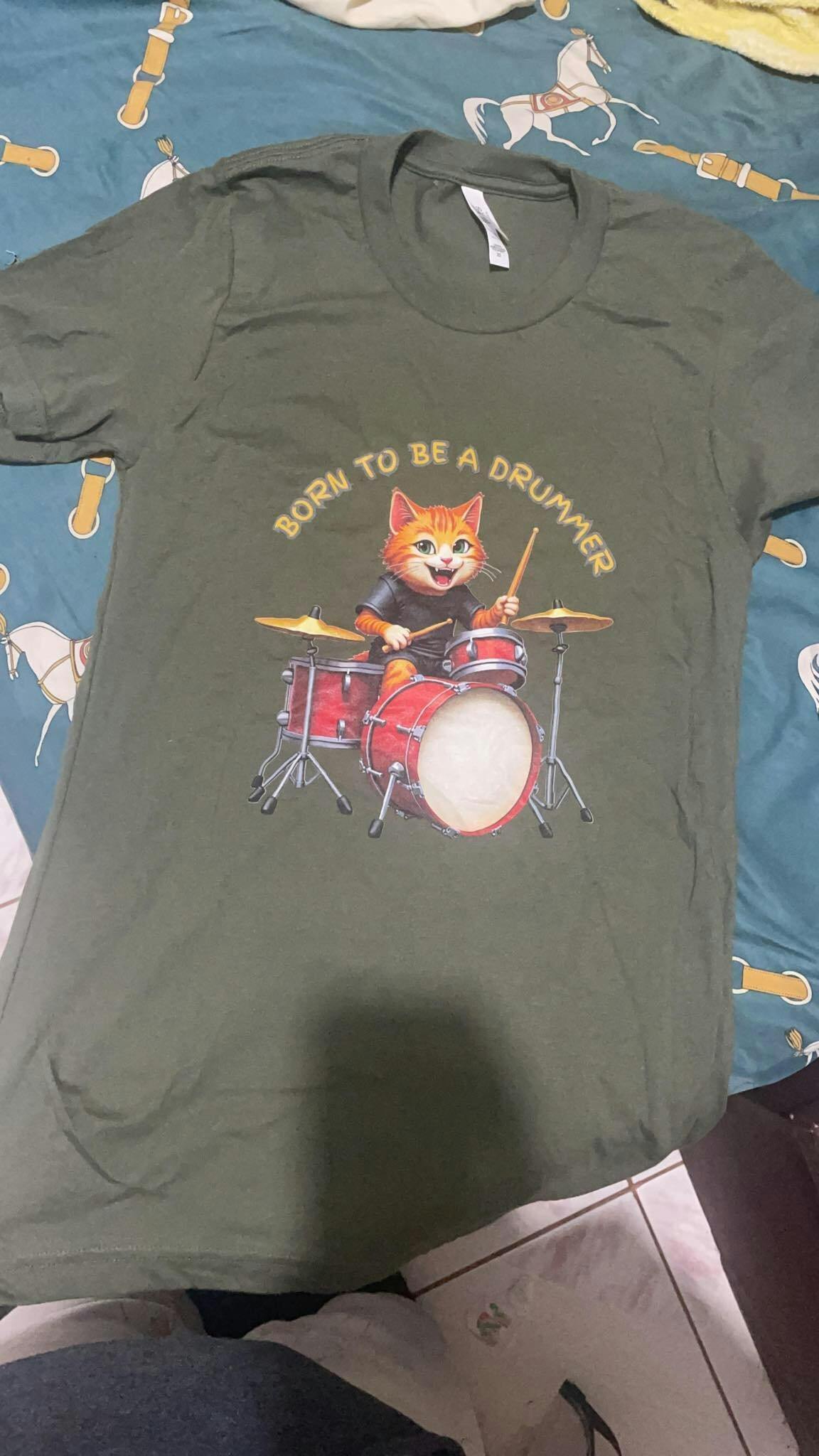 Gray t-shirt with a cat playing drums graphic and 'Born to be a Drummer' text on a white background